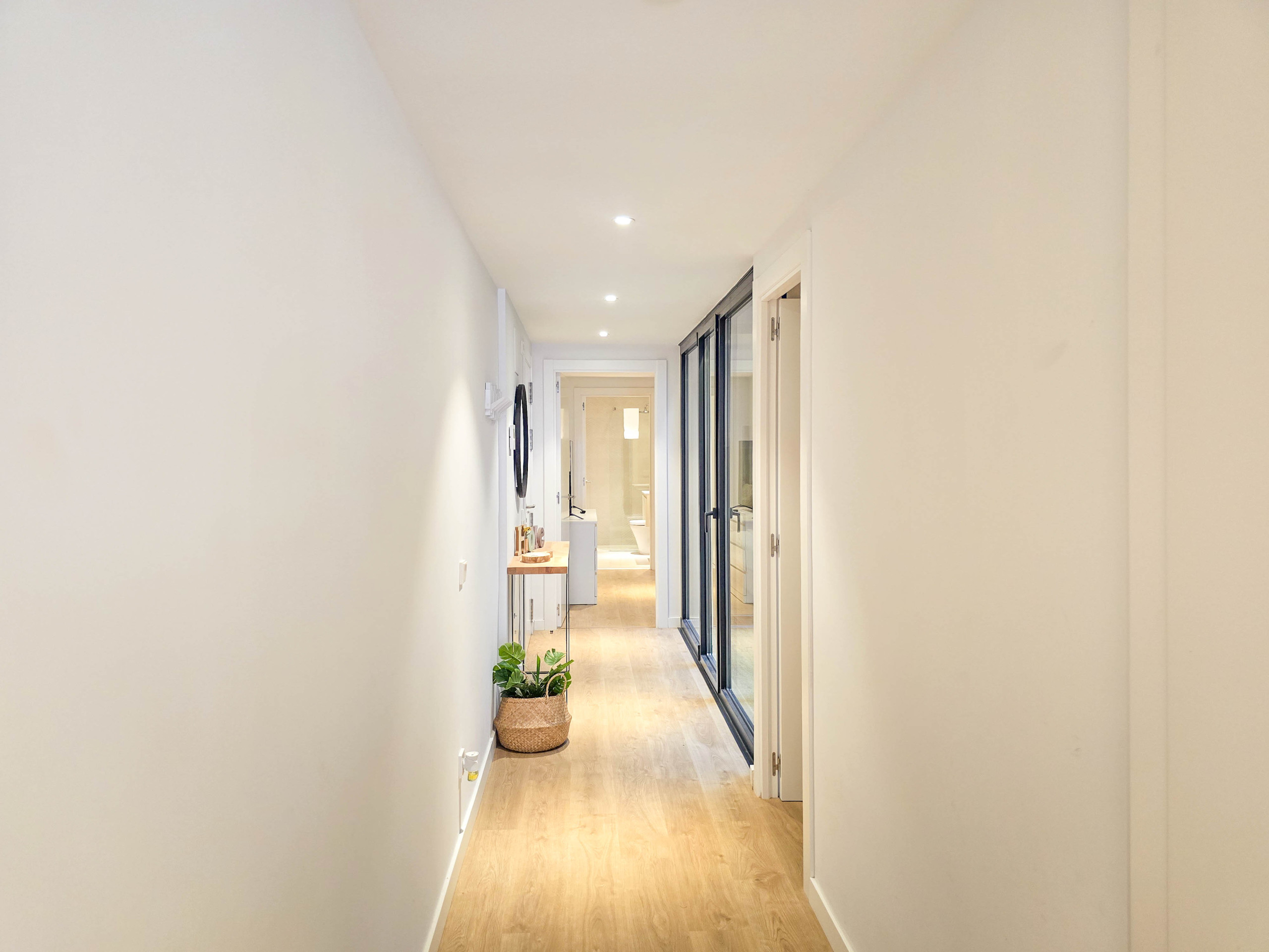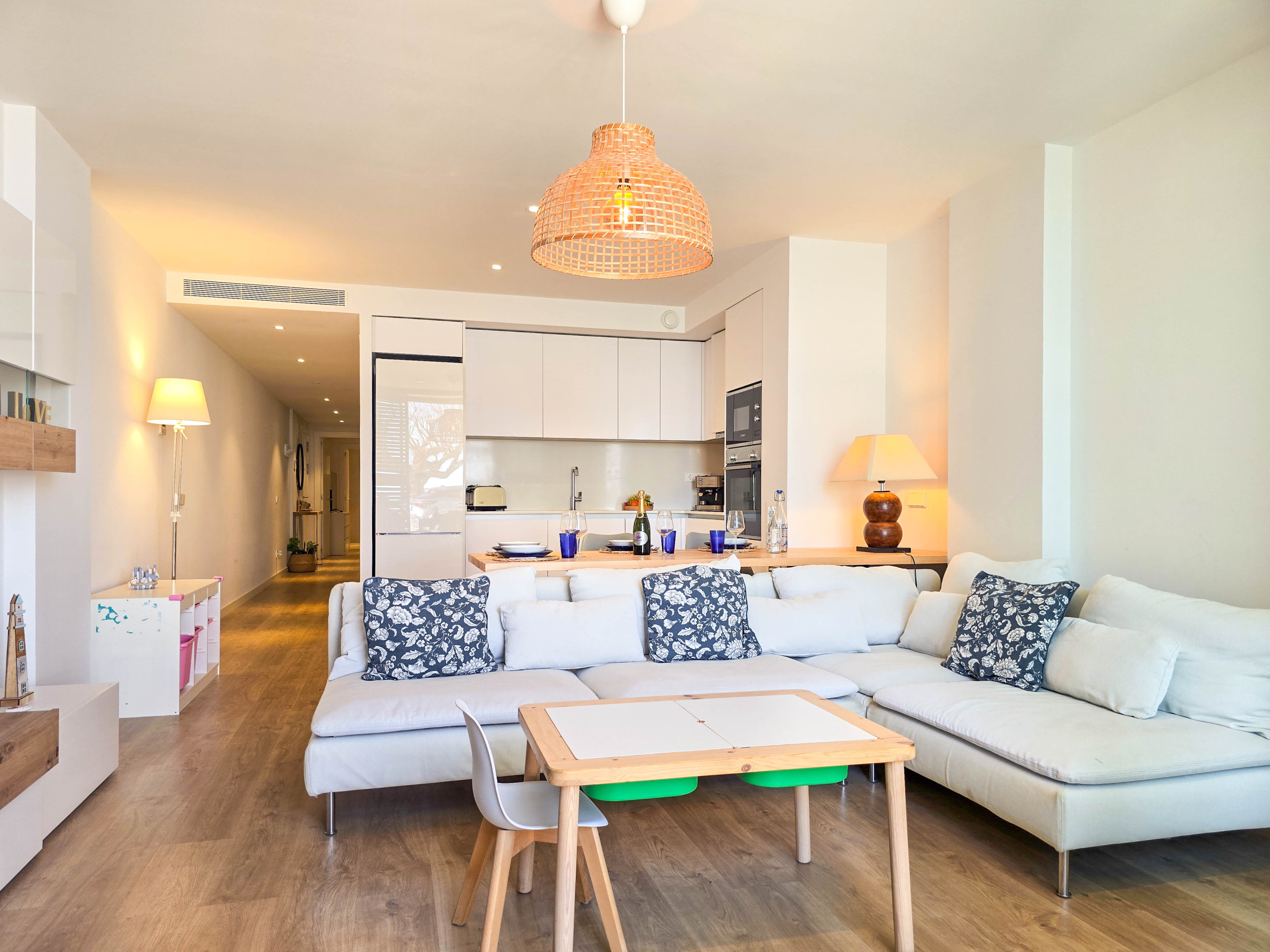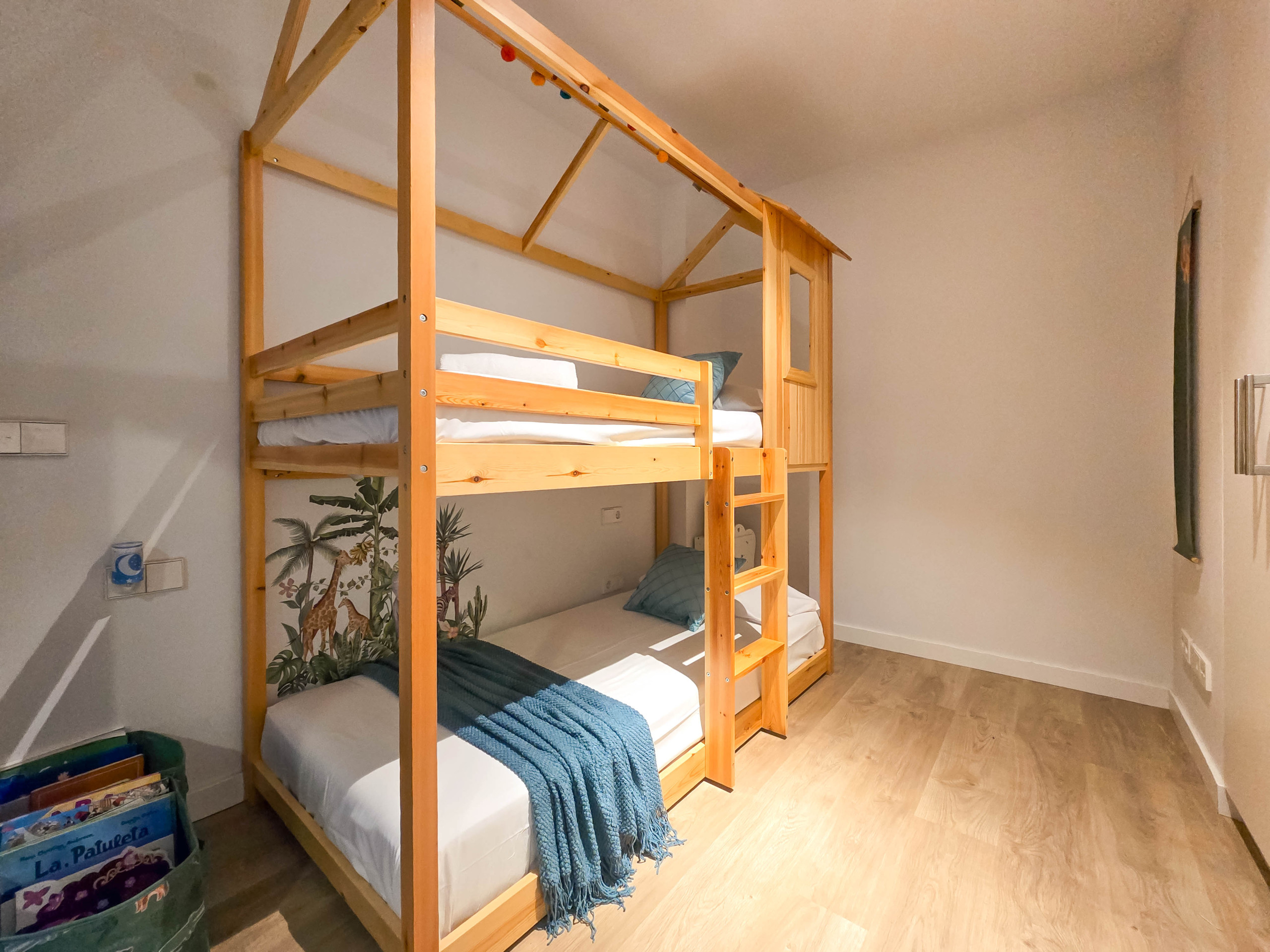 Dispone de dos habitaciones bien diferenciadas: una habitación tipo suite con cama de matrimonio y baño privado con ducha, y una segunda habitación con una litera compuesta por dos camas individuales, ideal para niños o jóvenes. Ambas habitaciones tienen acceso a un patio interior que aporta luz natural y ventilación. Además, el apartamento cuenta con un segundo baño completo con ducha situado en el pasillo.