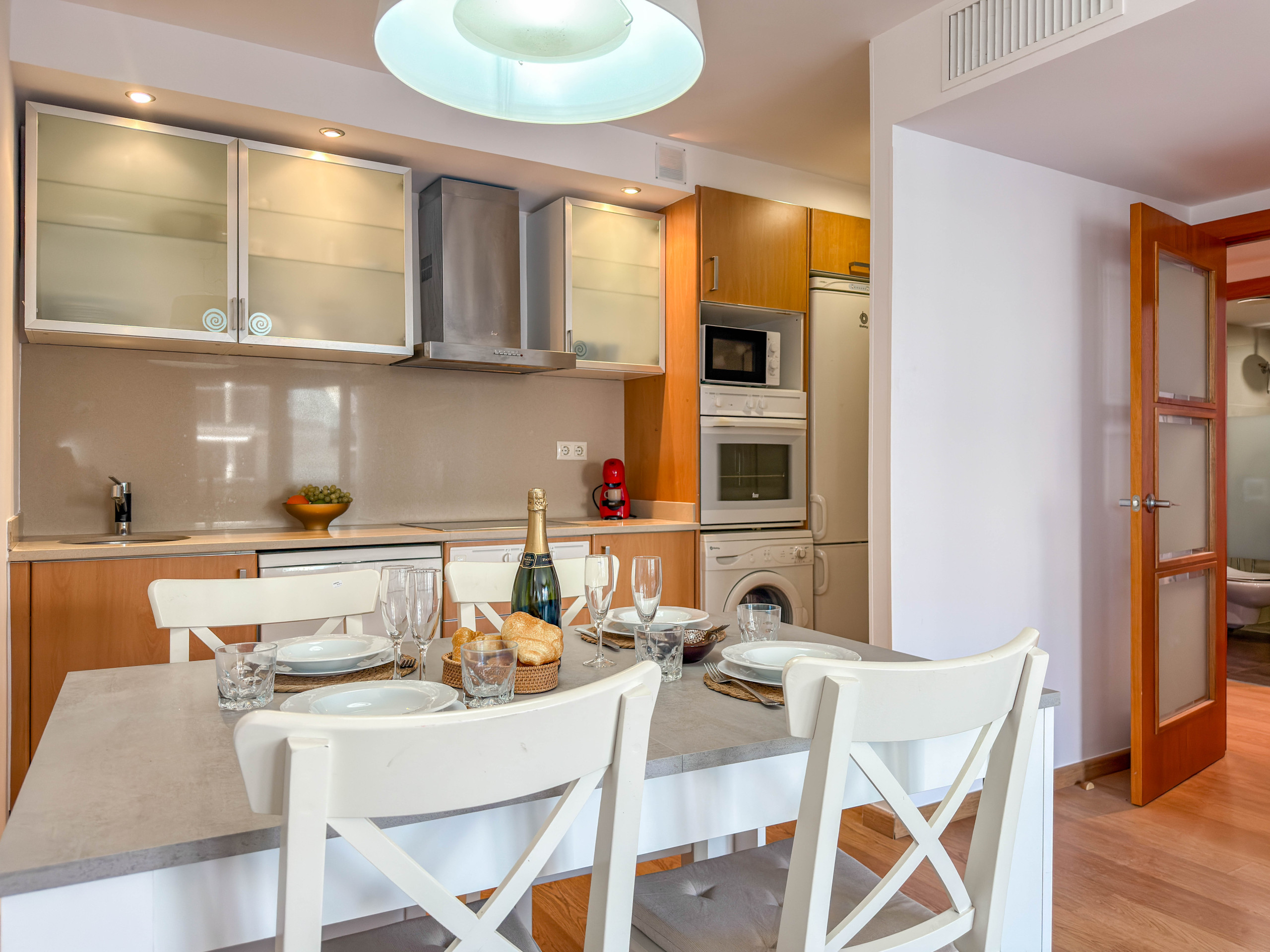 El salón-comedor es amplio y luminoso, con aire acondicionado, calefacción, televisión, un sofá y una mesa de comedor para cuatro personas. La cocina está abierta al comedor y está completamente equipada con electrodomésticos y utensilios de cocina, incluyendo lavavajillas, horno, microondas y lavadora.