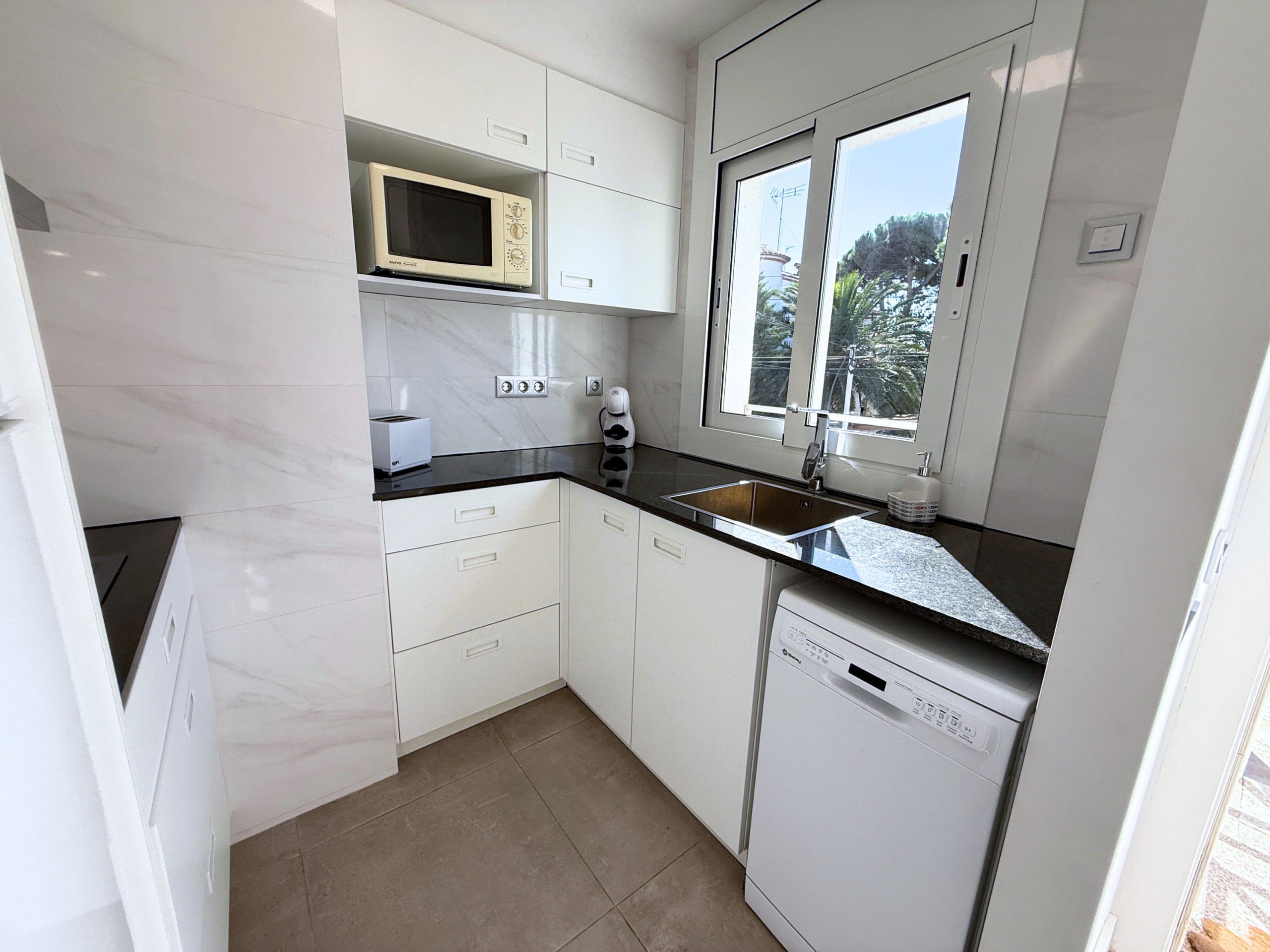 El luminoso salón-comedor se conecta con una cocina independiente totalmente equipada, pensada para preparar cómodamente desayunos y cenas en familia. Desde esta zona se accede a la terraza, el rincón perfecto para relajarse, dejarse llevar por la brisa marina y contemplar mágicos atardeceres frente al Mediterráneo.