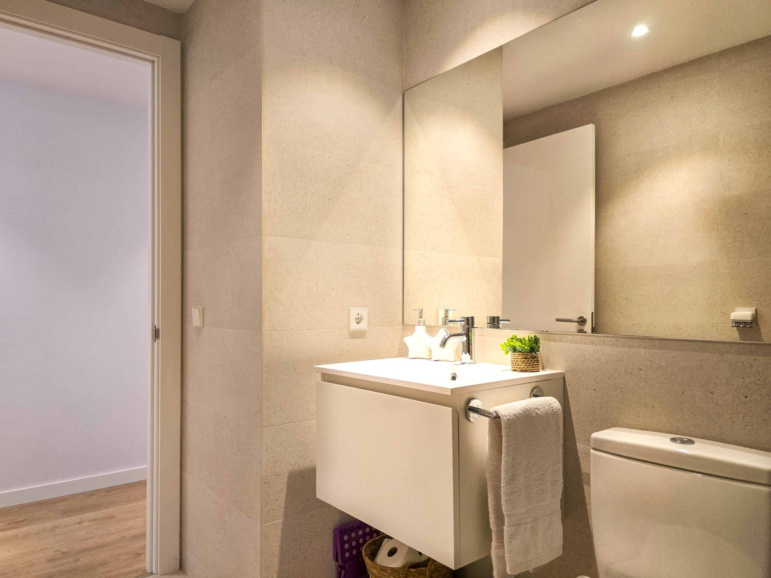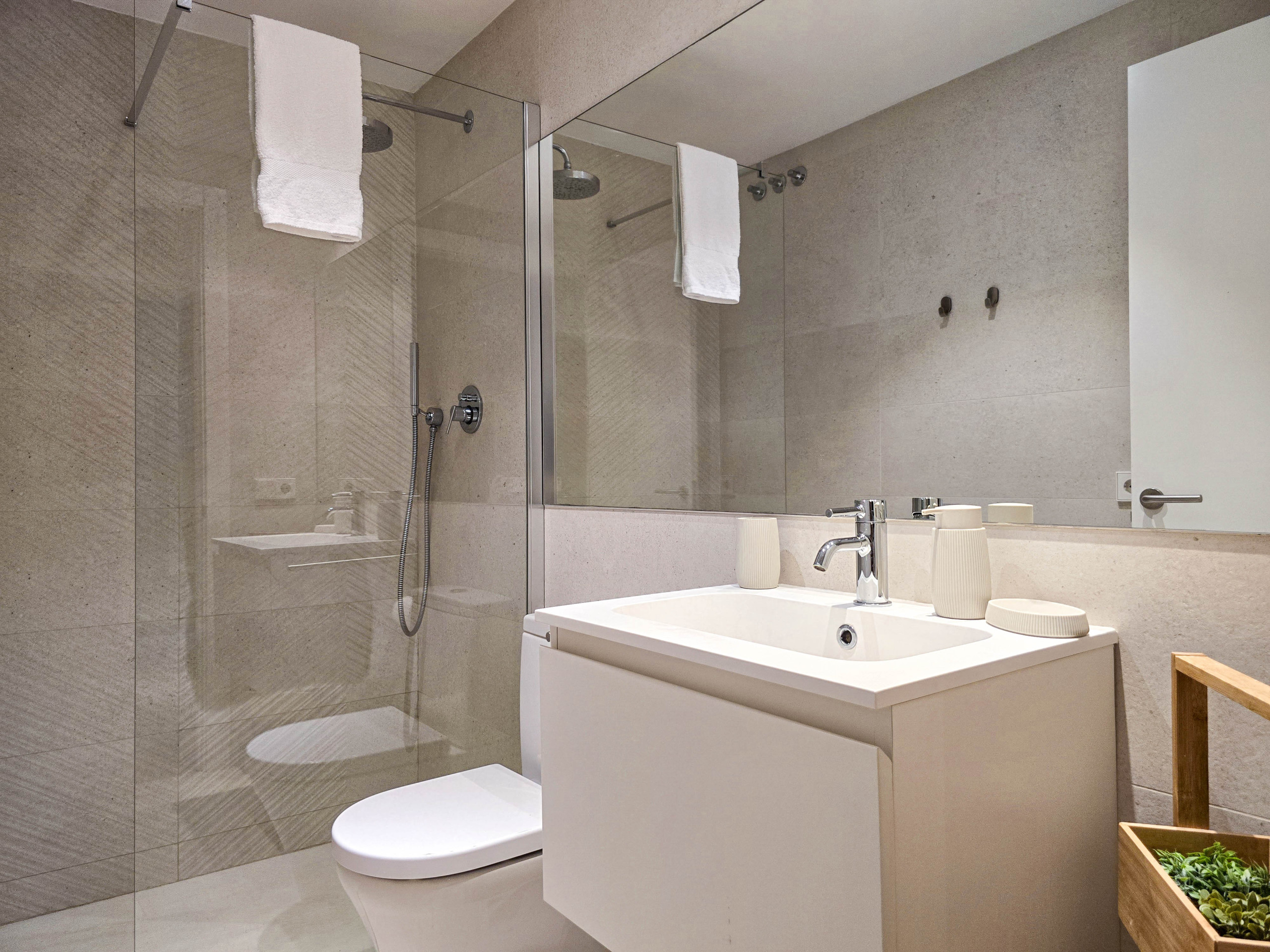 Disposa de dues habitacions ben diferenciades: una habitació tipus suite amb llit de matrimoni i bany privat amb dutxa, i una segona habitació amb una llitera formada per dos llits individuals, ideal per a nens o joves. Ambdues habitacions tenen accés a un pati interior que aporta llum natural i ventilació. A més, l’apartament compta amb un segon bany complet amb dutxa situat al passadís.
