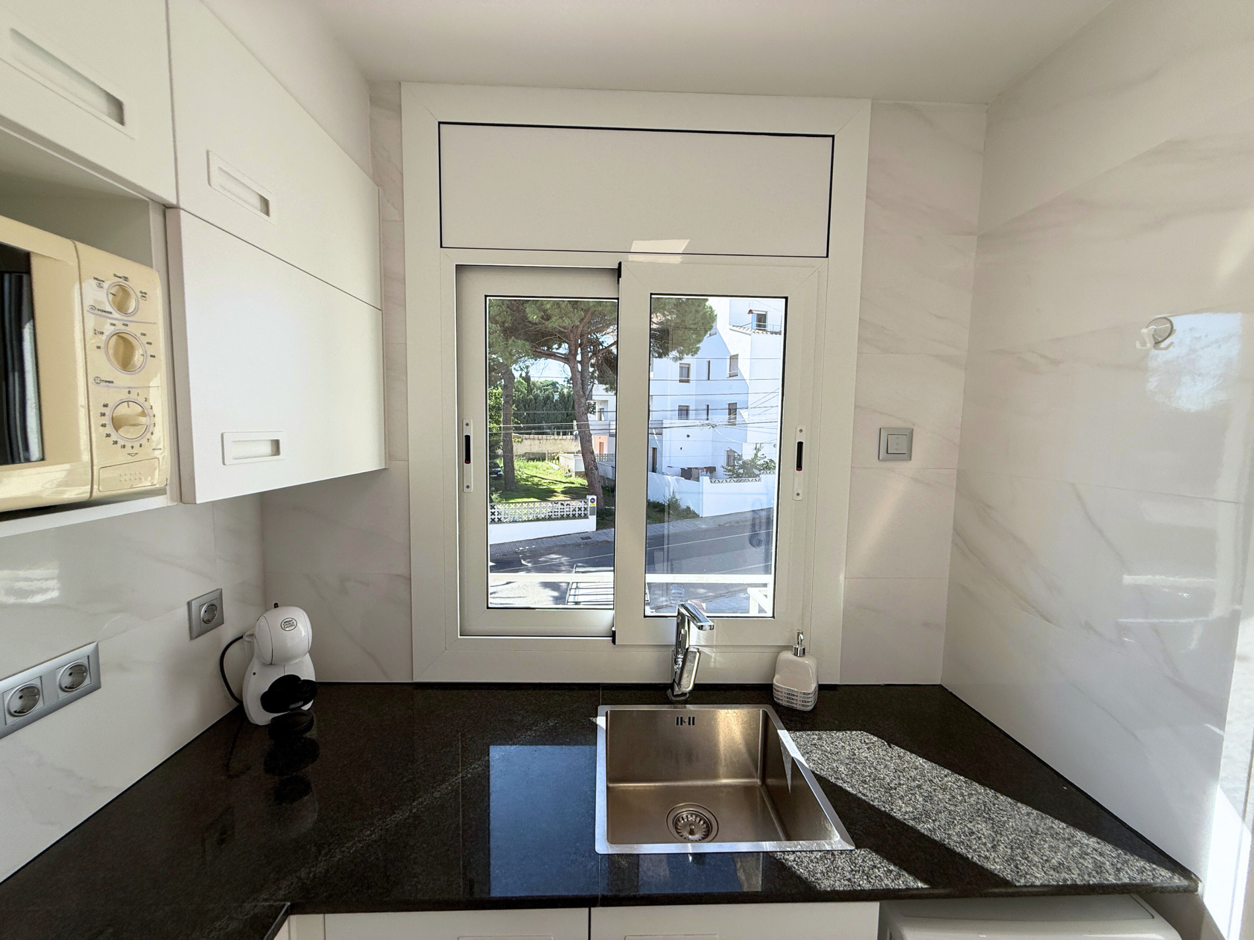 El lluminós saló-menjador es comunica amb una cuina independent totalment equipada, pensada per preparar còmodament esmorzars i sopars en família. Des d’aquí s’accedeix a la terrassa moblada, l’espai ideal per relaxar-se, sentir la brisa marina i contemplar màgics capvespres davant del Mediterrani.