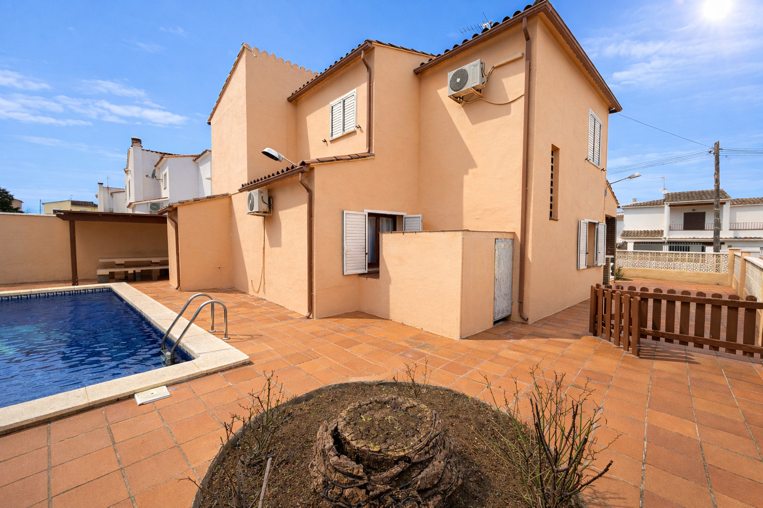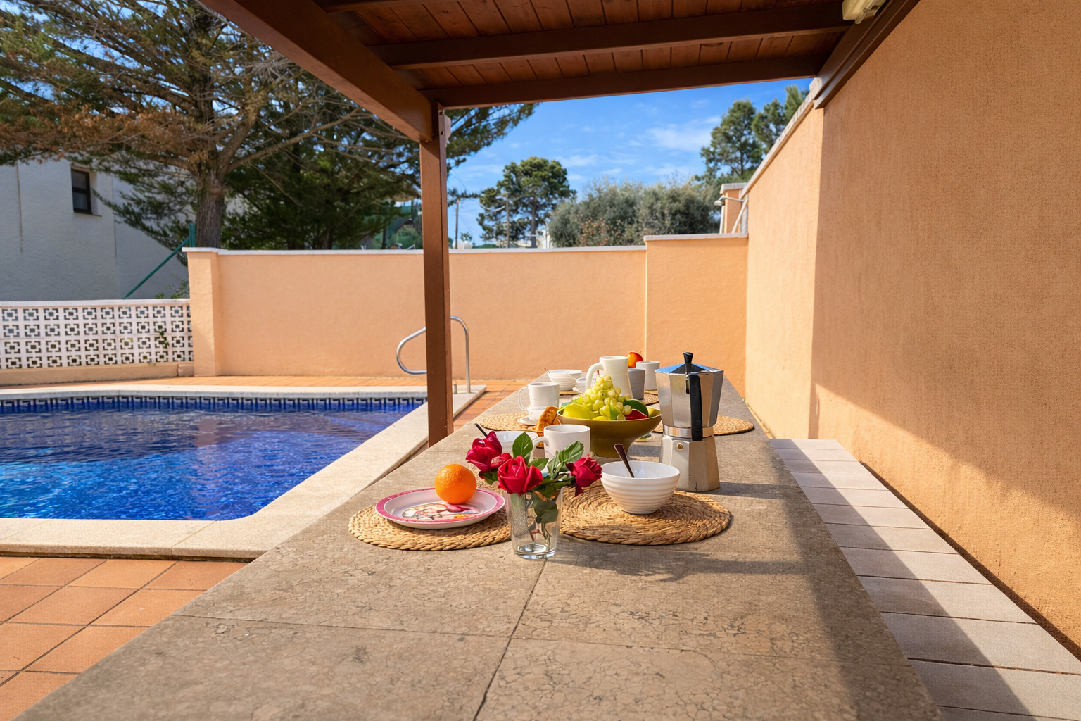 It features a bright living-dining room with air conditioning and a fully equipped independent kitchen with appliances and kitchenware. Outside, the house offers a pleasant private area with an exclusive-use swimming pool, open all year round, and space to park one vehicle within the property.