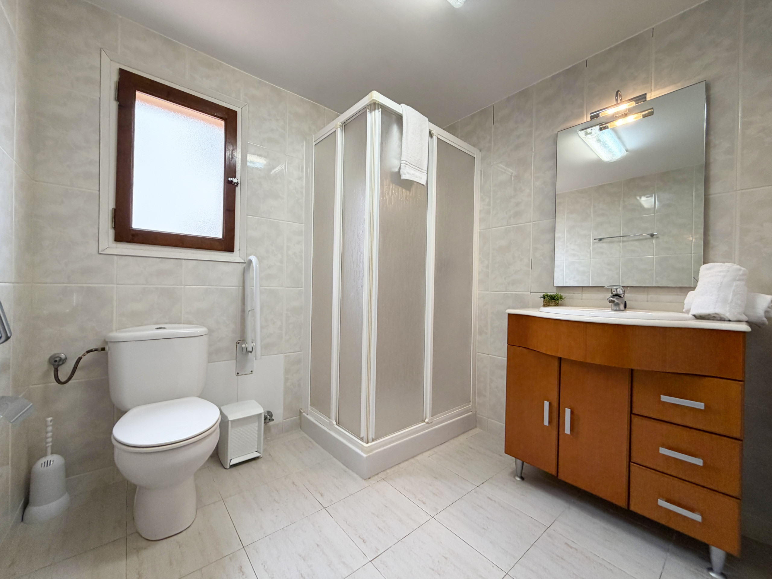The property can accommodate up to 8 guests and is distributed over four bedrooms: two with double beds, one with two single beds and one with bunk beds. It has two full bathrooms with showers, one on the ground floor and one on the upper floor.