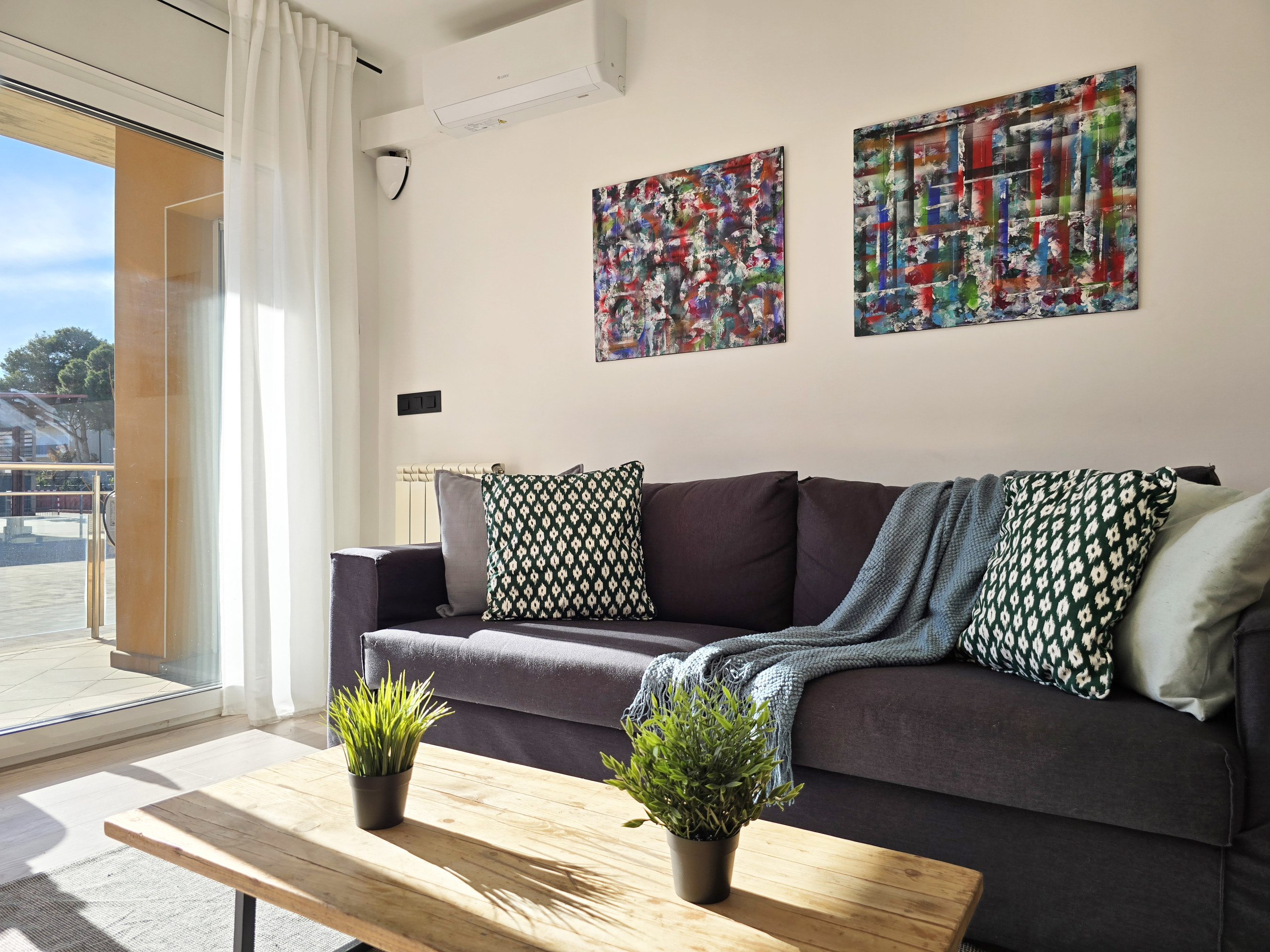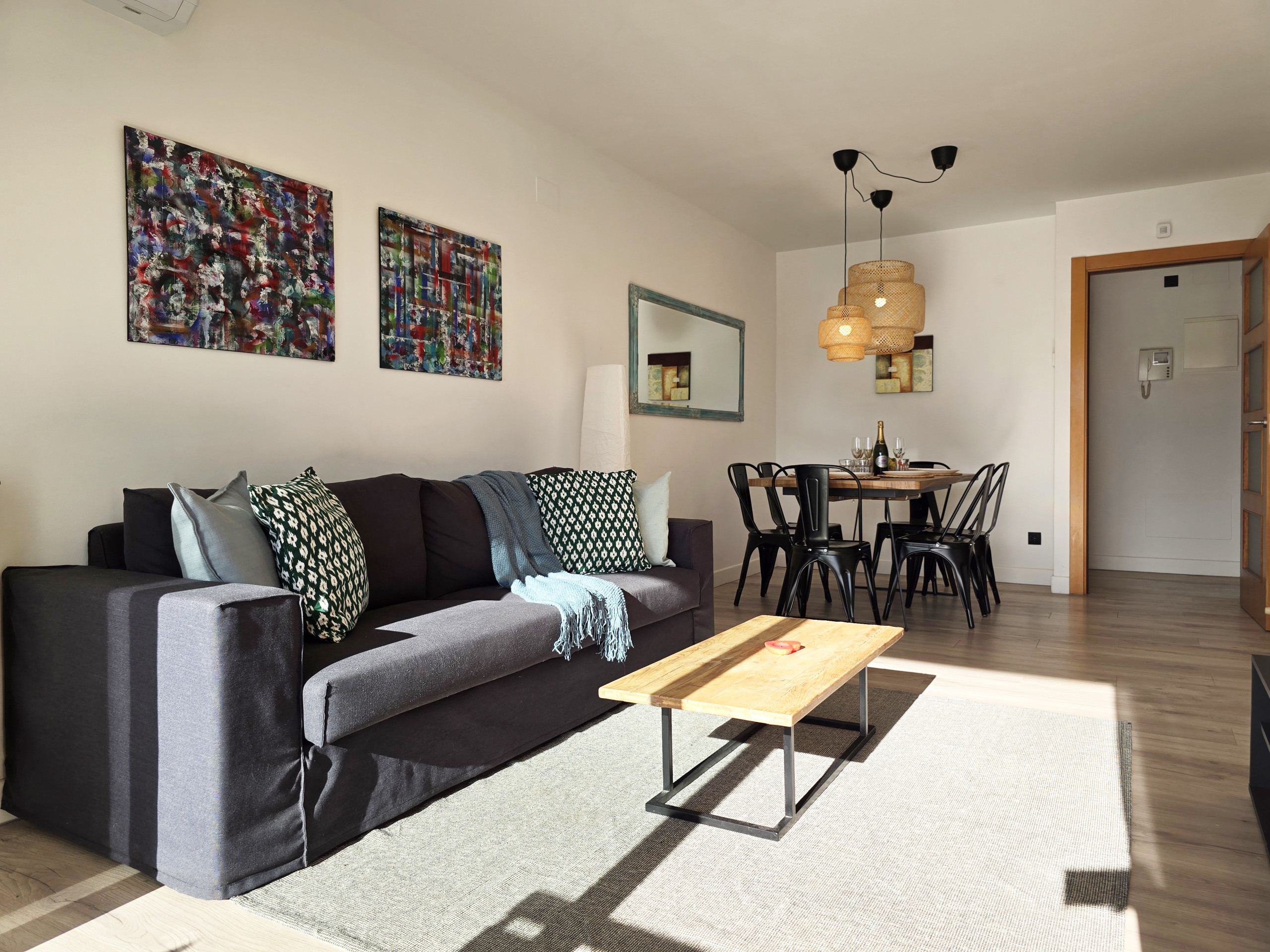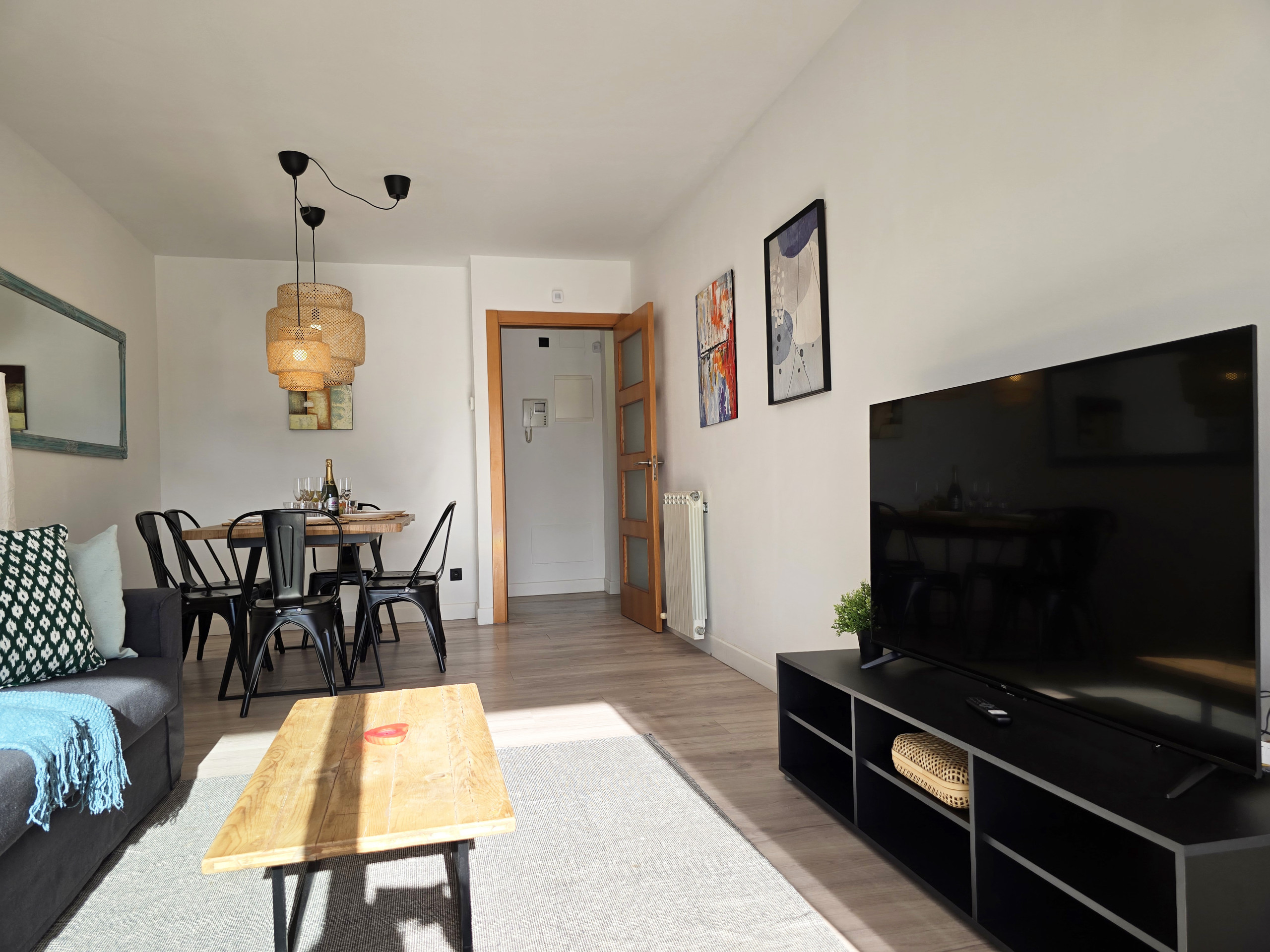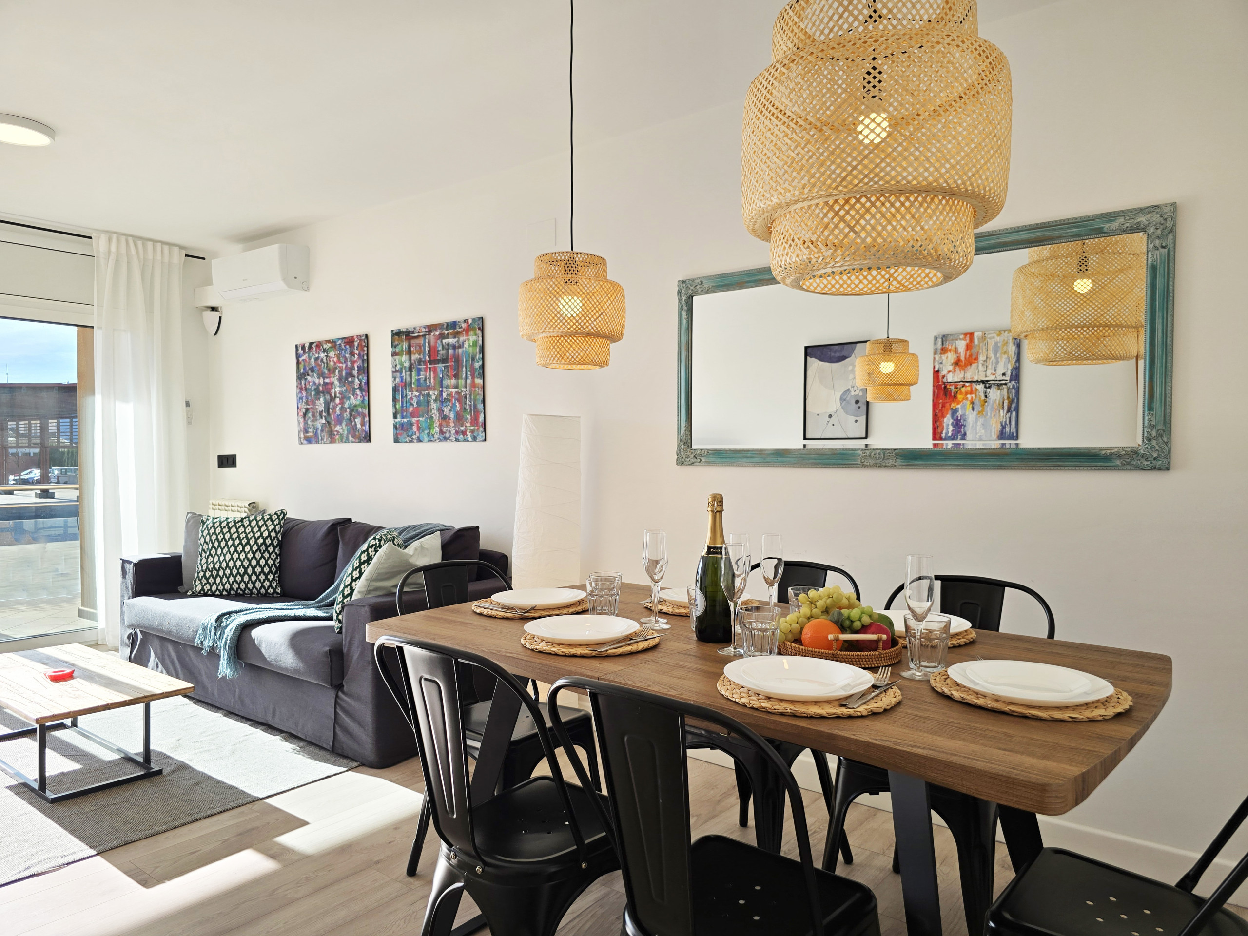 Le logement dispose d’un salon-salle à manger lumineux avec accès direct à la terrasse, idéal pour se détendre, lire, profiter du climat agréable ou partager des repas et des moments en famille ou entre amis en plein air.