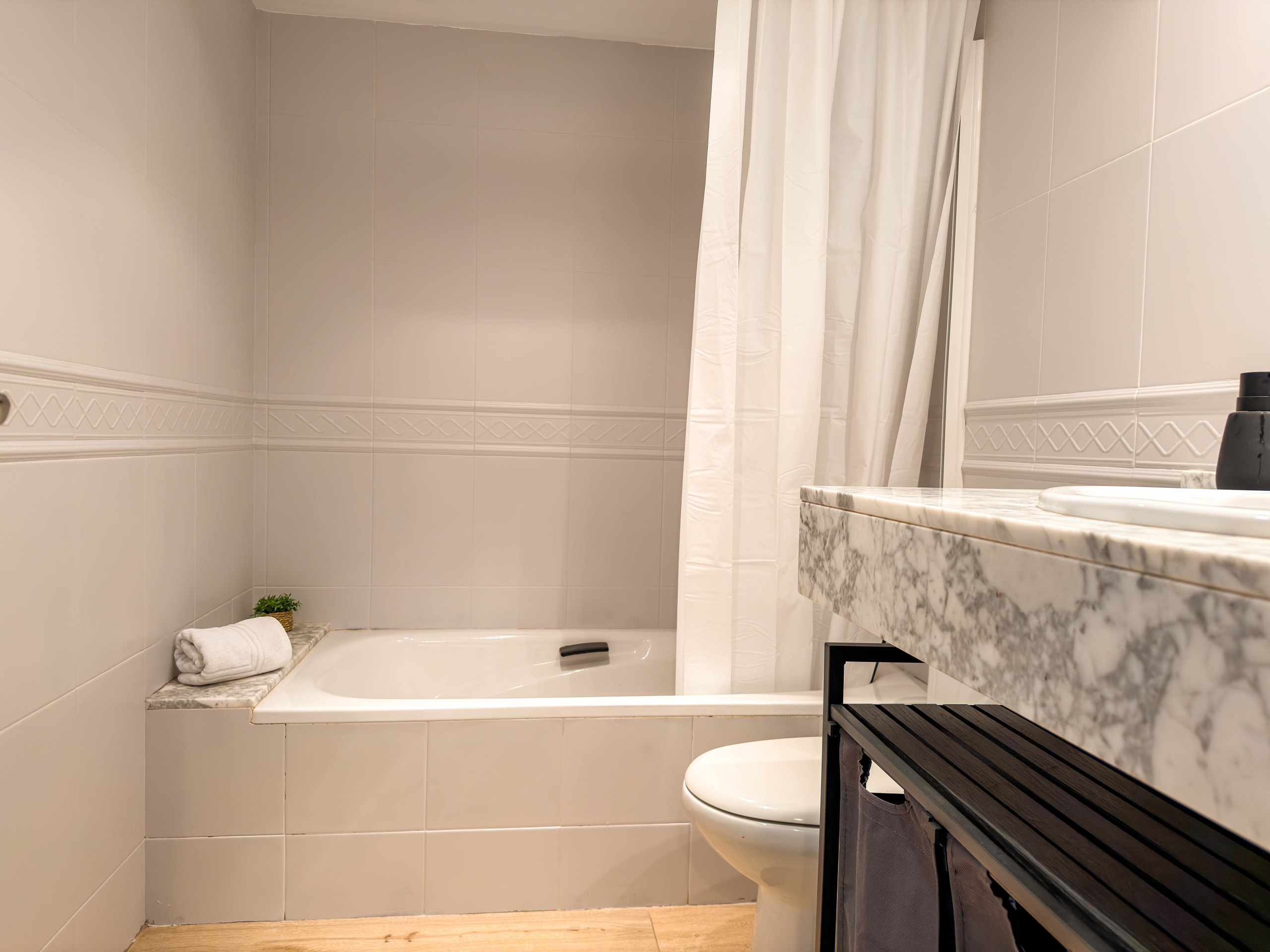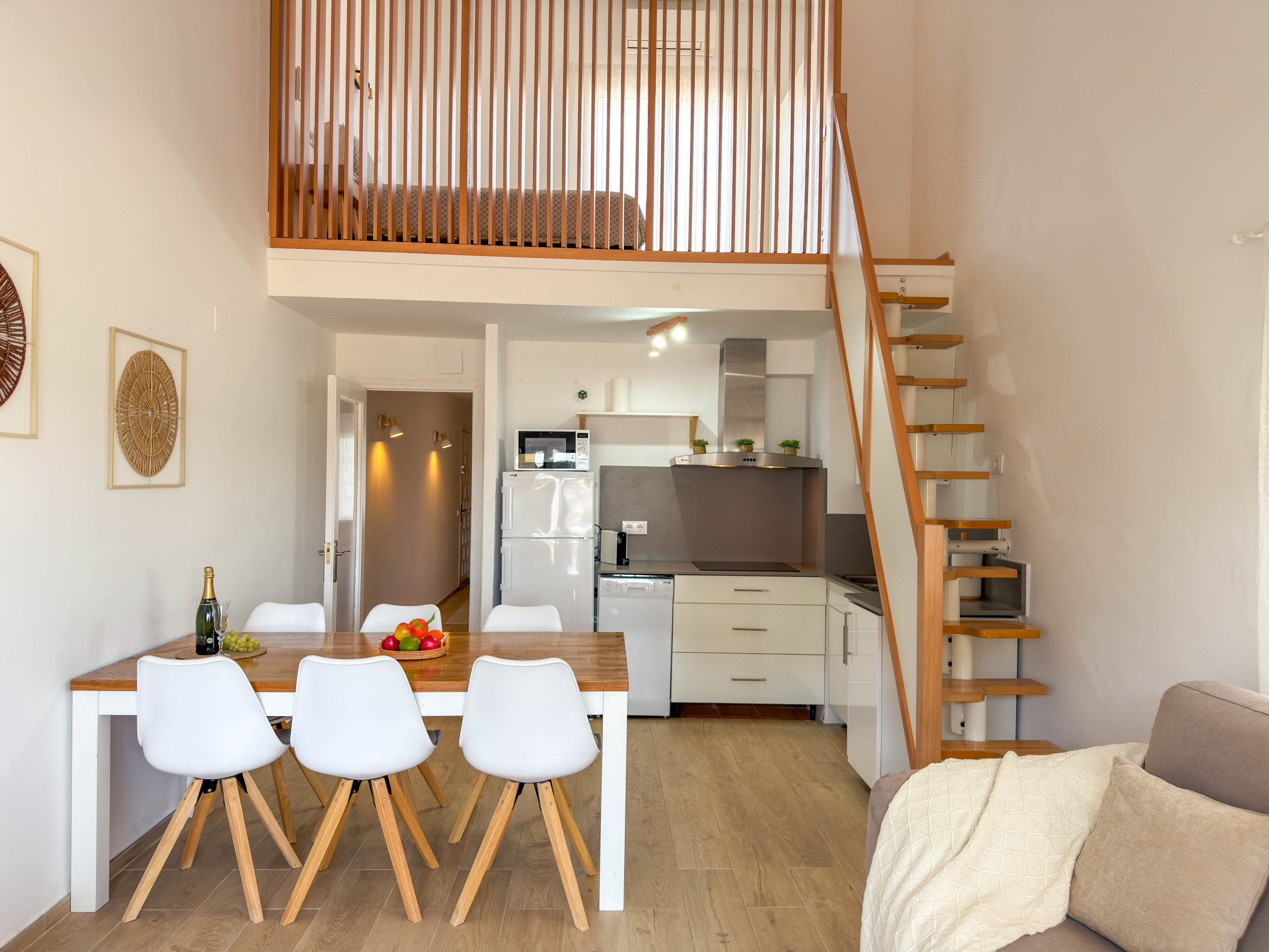 L’appartement dispose de deux chambres avec lits doubles et d’une salle de bain complète avec douche/baignoire. La cuisine est ouverte et entièrement équipée avec tout le nécessaire pour votre séjour, y compris four, micro-ondes, lave-vaisselle et lave-linge. La cuisine communique directement avec le salon-salle à manger, créant un espace spacieux et fonctionnel, qui donne accès à un balcon avec table, idéal pour manger ou se détendre en plein air.