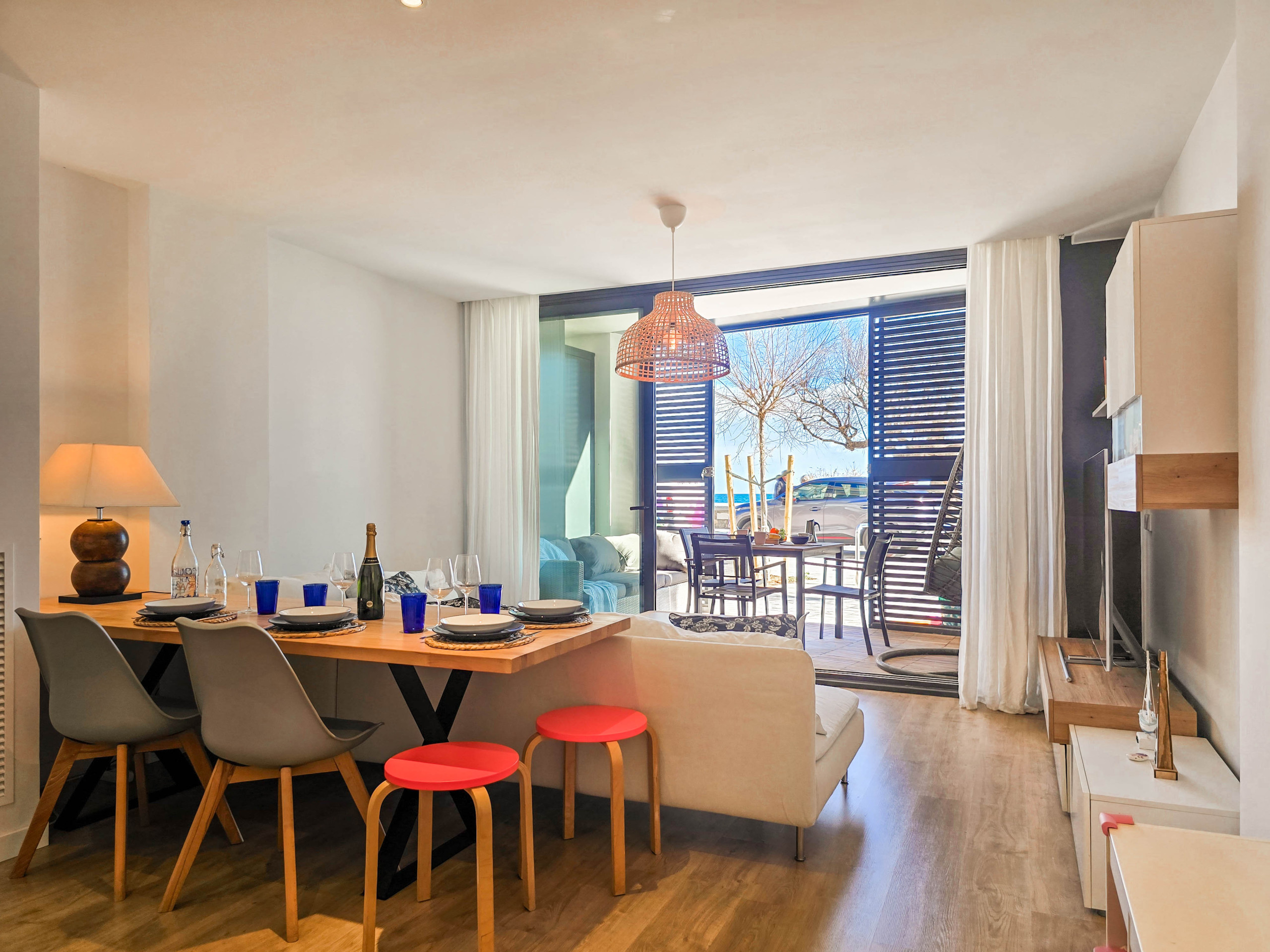 L’appartement est réparti sur un seul niveau et dispose d’un lumineux salon-salle à manger avec cuisine américaine entièrement équipée, comprenant plaque vitrocéramique, four, micro-ondes, cafetière et tous les appareils nécessaires pour un séjour confortable. Le salon dispose d’un canapé et d’une télévision, et donne directement accès à une agréable terrasse avec vue sur la mer, aménagée pour profiter de l’extérieur. Le logement est équipé de climatisation et de chauffage, garantissant un confort toute l’année.
