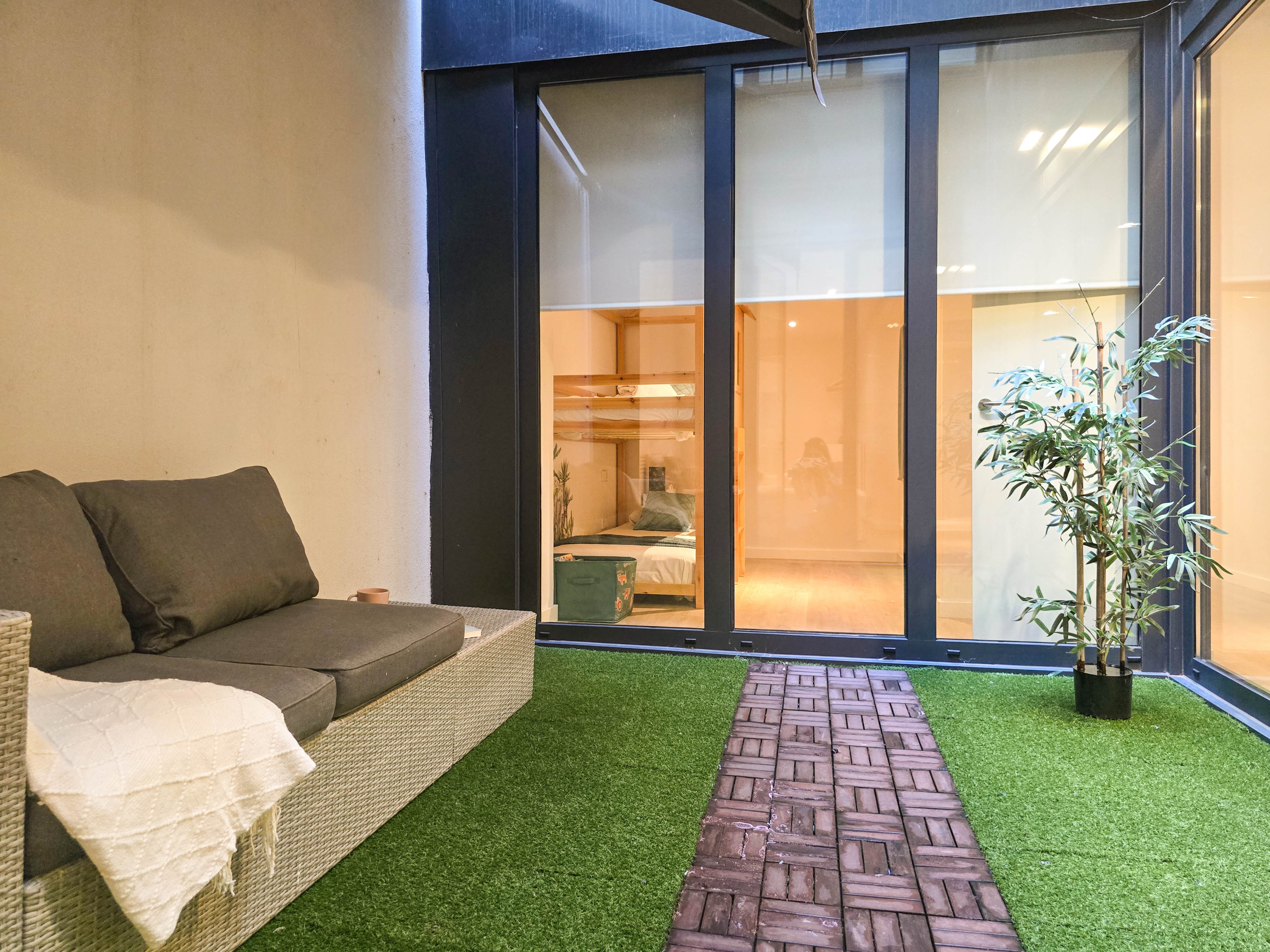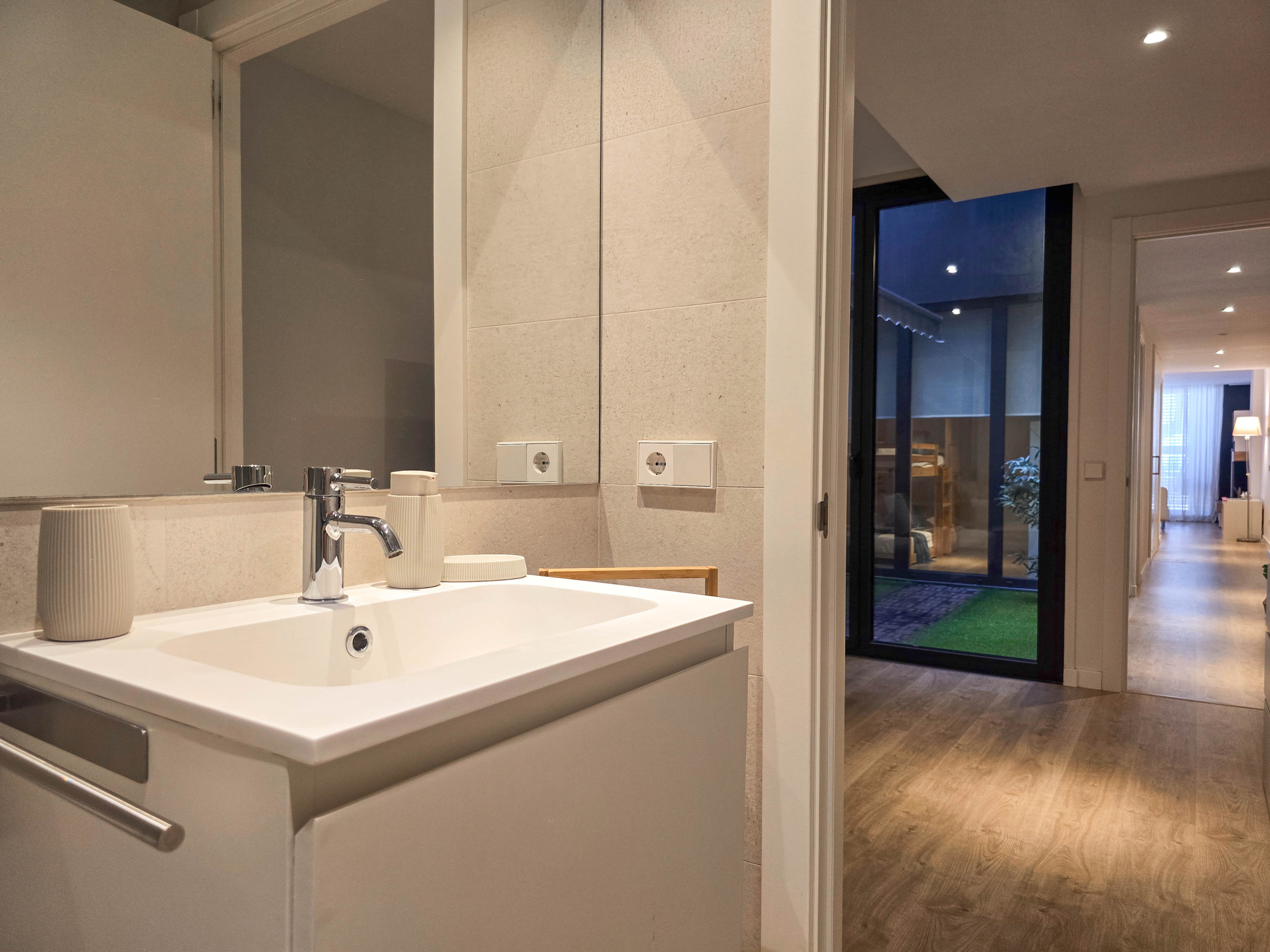 Il dispose de deux chambres bien distinctes : une suite avec lit double et salle de bain privée avec douche, et une seconde chambre avec lits superposés composée de deux lits simples, idéale pour les enfants ou les jeunes. Les deux chambres ont accès à un patio intérieur apportant lumière naturelle et ventilation. L’appartement dispose également d’une seconde salle de bain complète avec douche située dans le couloir.