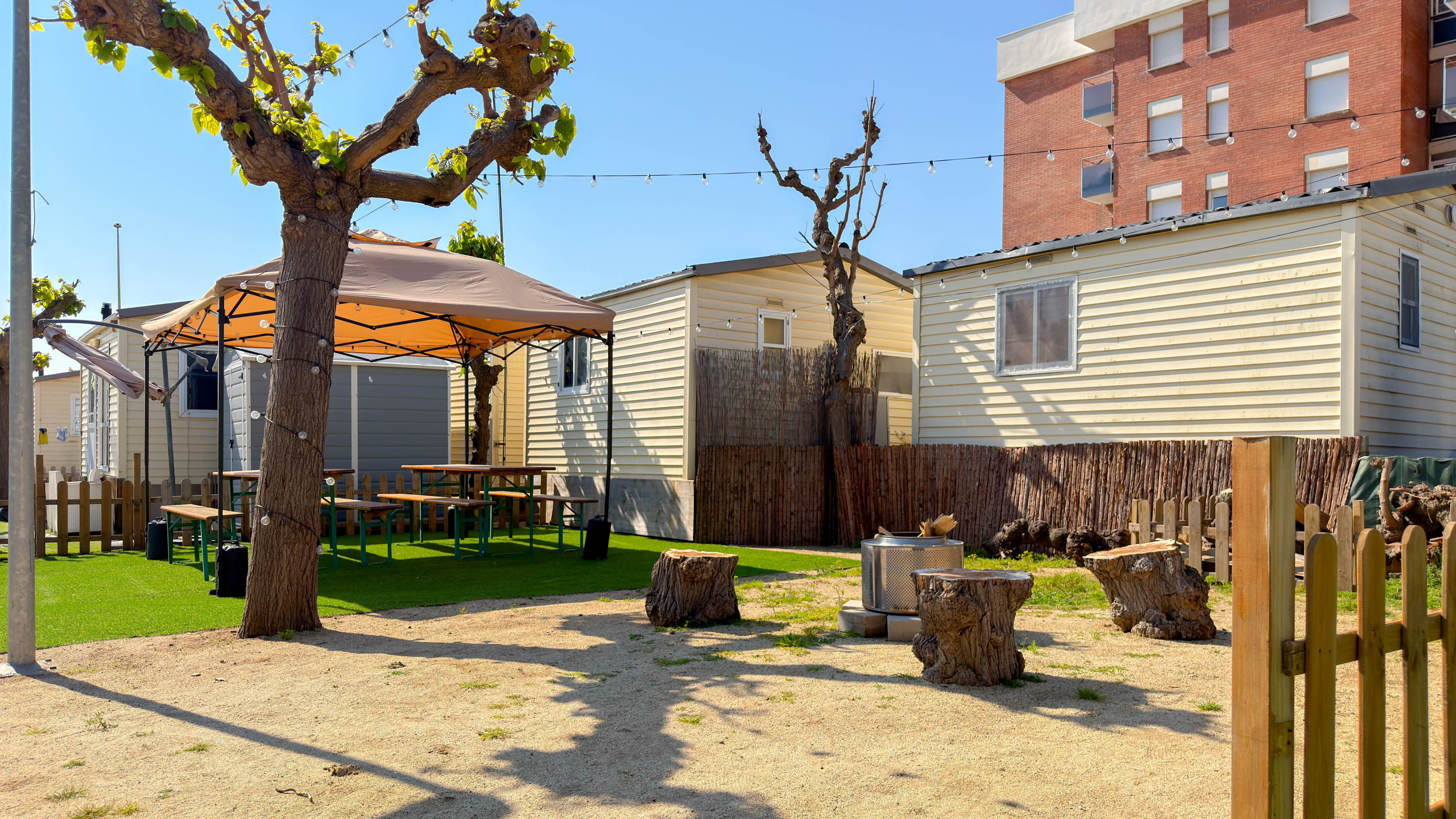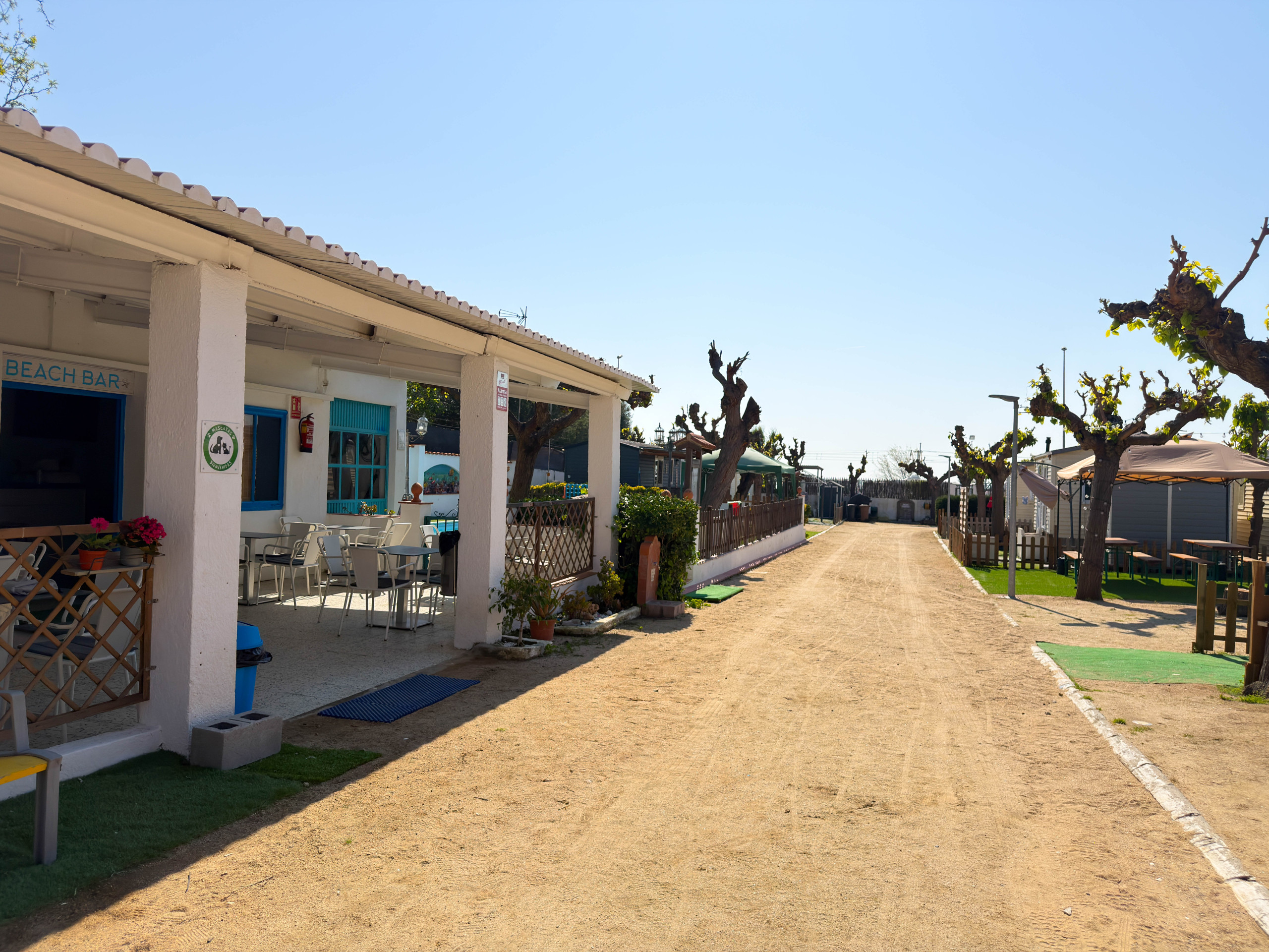 À l’extérieur, vous pourrez profiter d’une agréable terrasse avec parasol et deux chaises, parfaite pour se détendre, lire ou prendre le petit-déjeuner en plein air. Les sanitaires et douches se trouvent dans les espaces communs du camping, à seulement 1 minute à pied de la tente, ce qui garantit un confort optimal tout au long de votre séjour. Le camping propose également des services et des espaces de loisirs pour tous : un bar à proximité où vous pourrez prendre le petit-déjeuner ou profiter de boissons et de quelques tapas, une piscine commune, une aire de jeux pour enfants avec balançoires et un petit terrain de basket. L’emplacement est excellent, car vous pouvez facilement rejoindre à pied la plage ainsi que la gare, ce qui permet de se déplacer facilement sans voiture.
