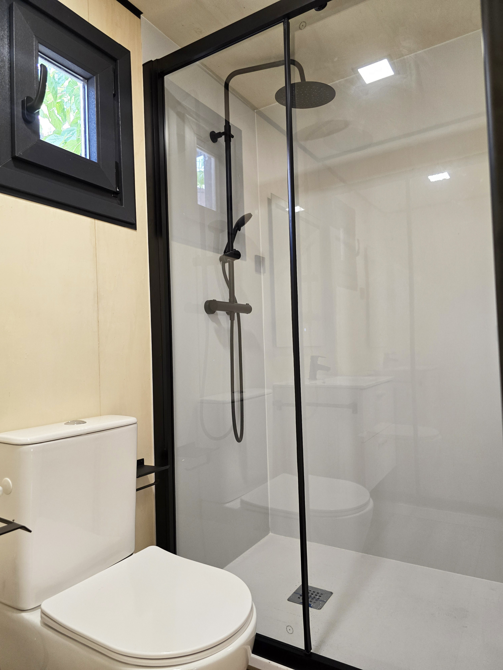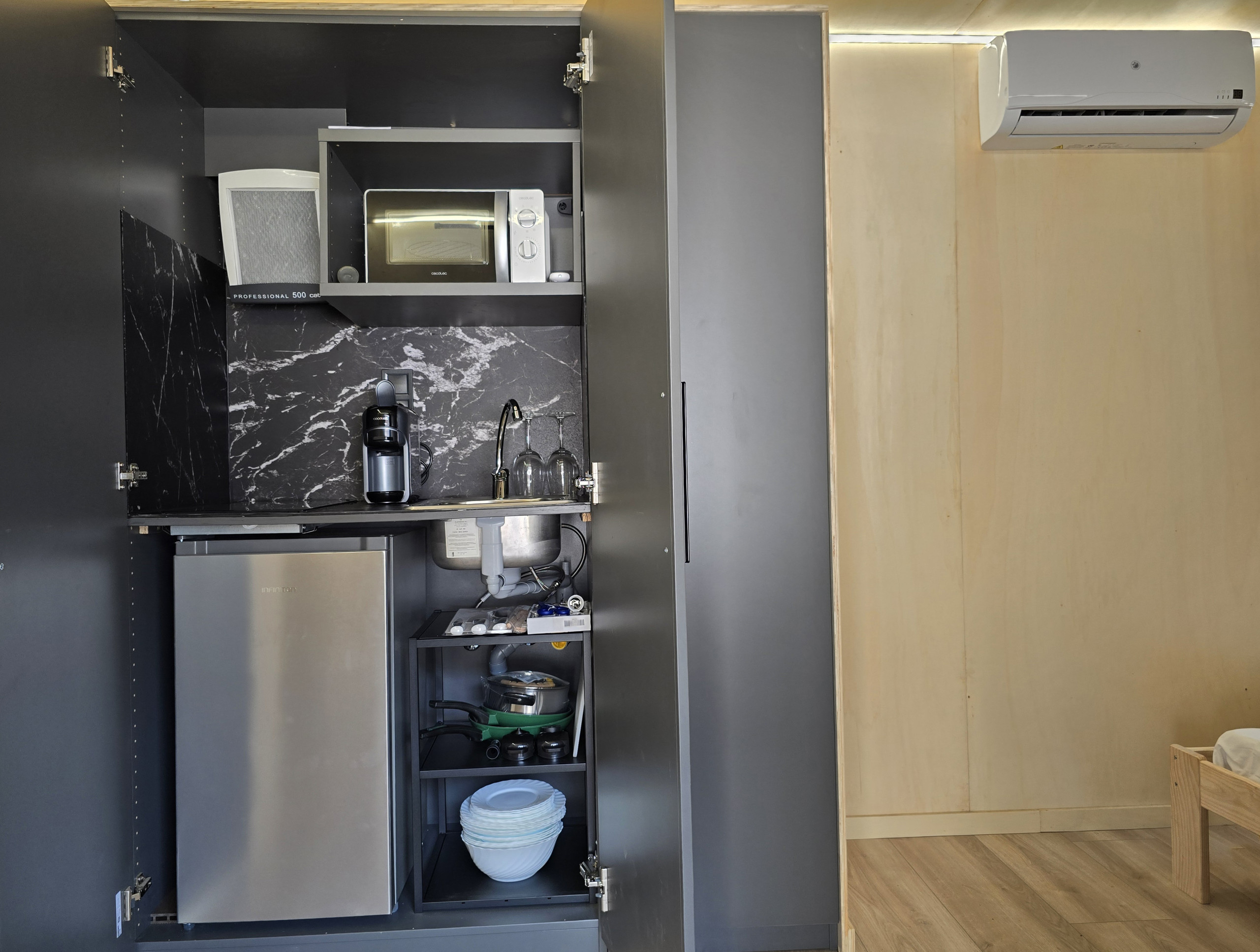 L'intérieur allie design moderne et fonctionnalité, avec un lit double, une kitchenette avec réfrigérateur et une salle de bain élégante avec douche de style contemporain.