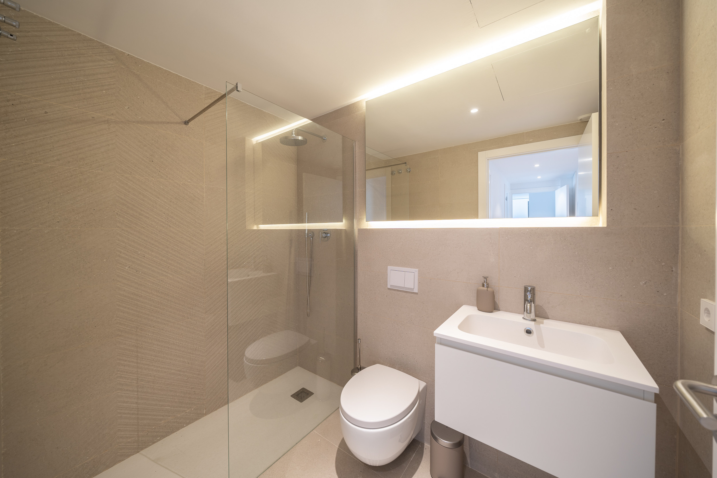 L’appartement dispose de deux chambres : une avec un lit double (150 cm), et une autre avec deux lits simples pouvant être rapprochés pour former un lit double. Le salon comprend également un canapé-lit double. La salle de bains est équipée d’une douche.